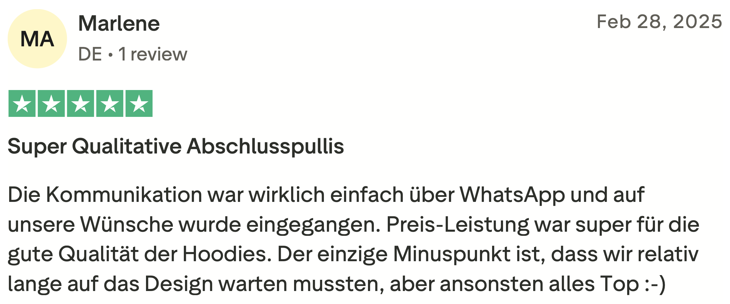 Mit jahrelanger Erfahrung in der Modebranche und einem engagierten Team aus Fachleuten bieten wir perfekten Abschlusshoodies für Eure Klasse.